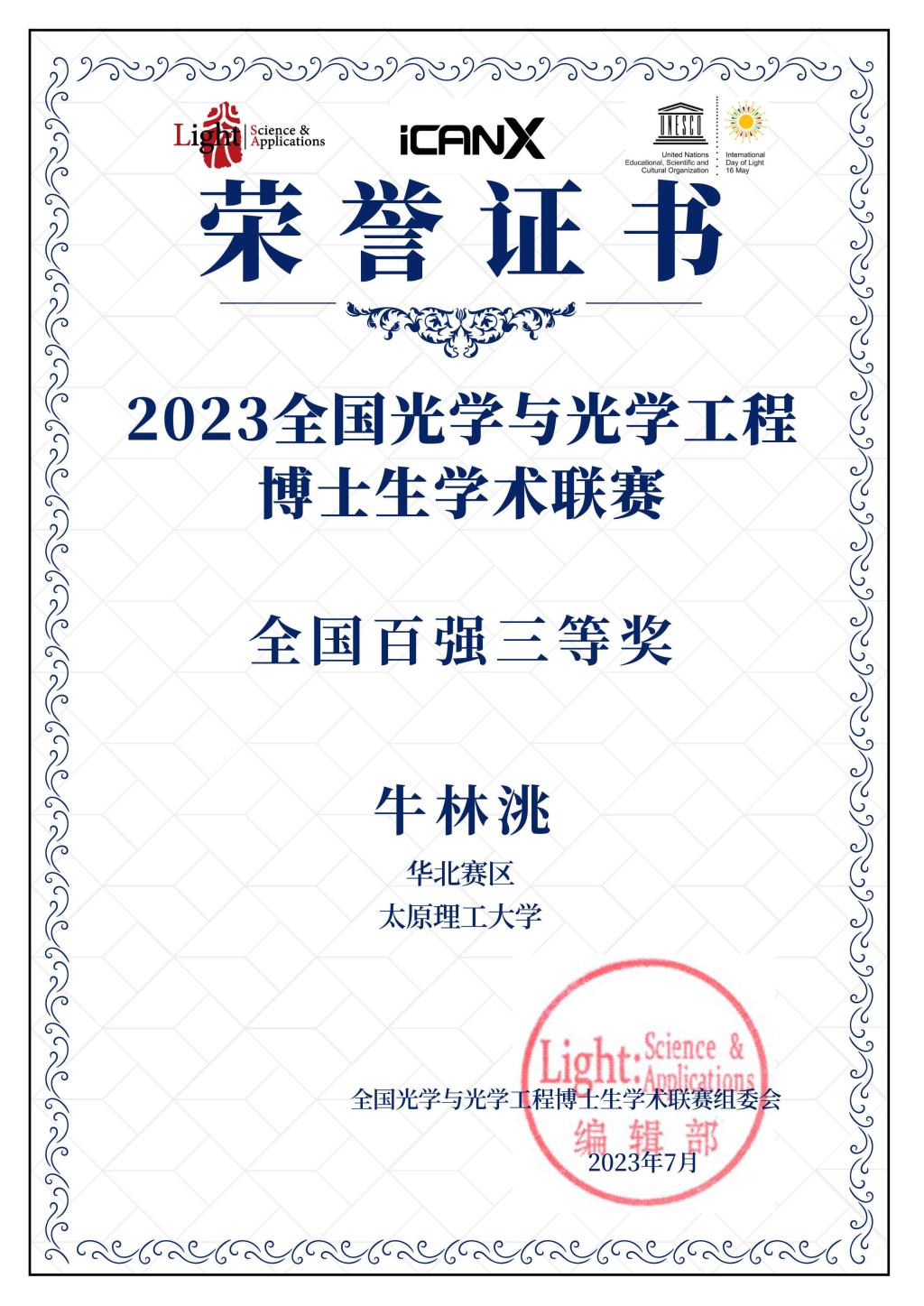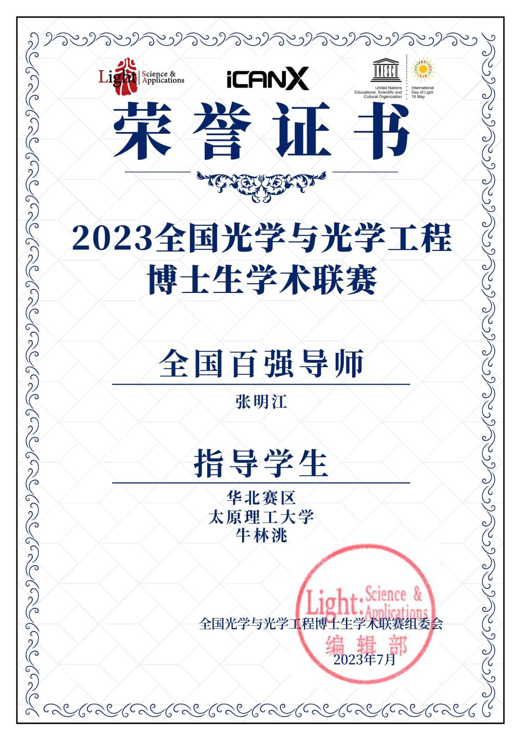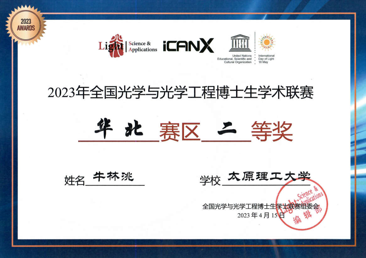 2023年7月16日,澳门网投官网张明江教授指导的博士生牛林洮在2023年全国光学与光学工程博士生学术联赛获全国百强三等奖,张明江教授获全国百强优秀导师称号。