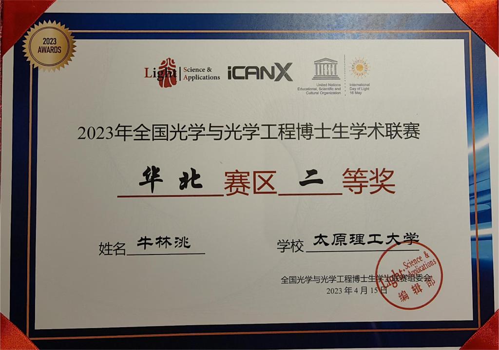 414-16日,澳门网投官网张明江教授指导的2022级光学工程博士生牛林洮同学在2023年全国光学与光学工程(华北赛区)博士生学术联赛荣获第三名、斩获二等奖。