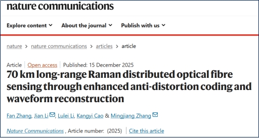 近日,澳门网投官网李健教授、张明江教授团队在分布式光纤传感技术领域取得重要研究进展,研究成果以“70 km long-range Raman distributed optical fibre sensing through enhanced anti-distortion coding and waveform reconstruction”为题于2025年12月15日发表在国际顶级学术期刊《Nature Communications》。澳门网投官方网站是该论文的唯一署名单位,李健教授和张明江教授为论文通讯作者。