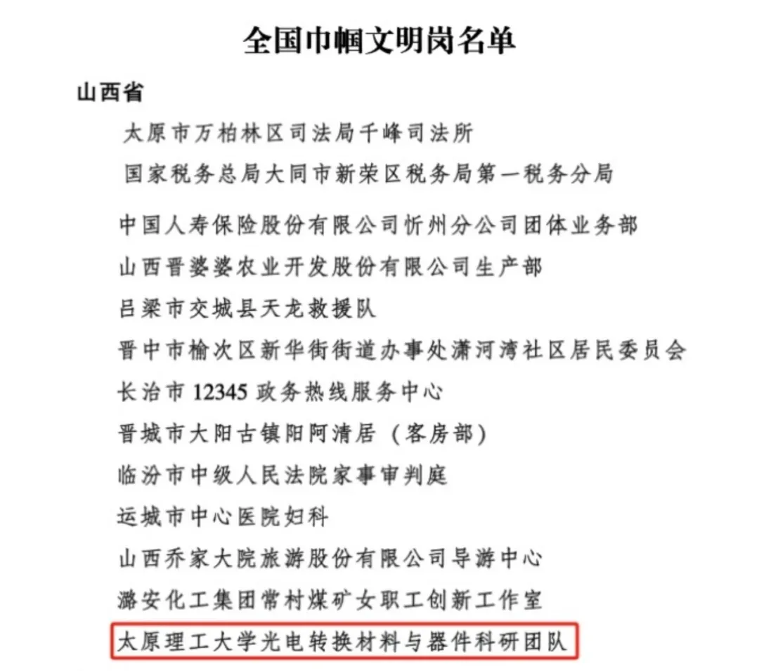 为表彰先进、树立榜样,激励广大妇女自尊自信、自立自强,奋进新征程、建功新时代,积极投身中国式现代化建设。近日,全国妇联公布《2024年度全国三八红旗手标兵、全国三八红旗手、全国三八红旗集体、全国巾帼文明岗名单》。澳门网投官网郝玉英教授团队“澳门网投官方网站光电转换材料与器件研究团队”荣获2024年度“全国巾帼文明岗”荣誉称号,为山西省荣获该殊荣的十三个集体之一。