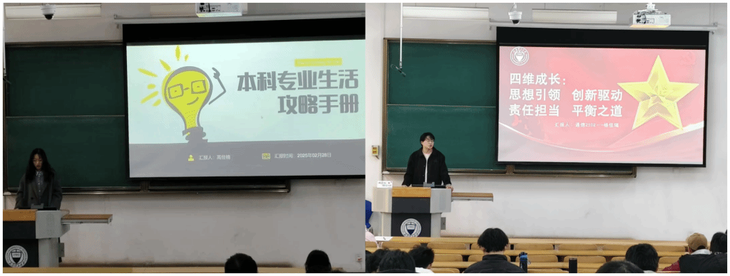 应物 2201 班何力同学结合自身实践,分享“三维成长法则”:通过四象限时间管理法平衡学业与工作,建立“基础巩固 - 思维拓展 - 实践创新”的学习体系,以“科研竞赛 + 暑期研修”双轨模式提升综合能力;通信 2102 班杨佳瑞着重强调党团活动对价值观塑造的作用,展现从“被动参与”到“主动引领”的成长蜕变轨迹;统计2102 班高佳楠以自身经历为蓝本,深入浅出地讲述“学生工作 + 学术科研 + 保研规划”的多维成长经验。三位学子通过差异化的发展路径,共同诠释了“奋斗是青春最亮丽的底色”这一时代命题。