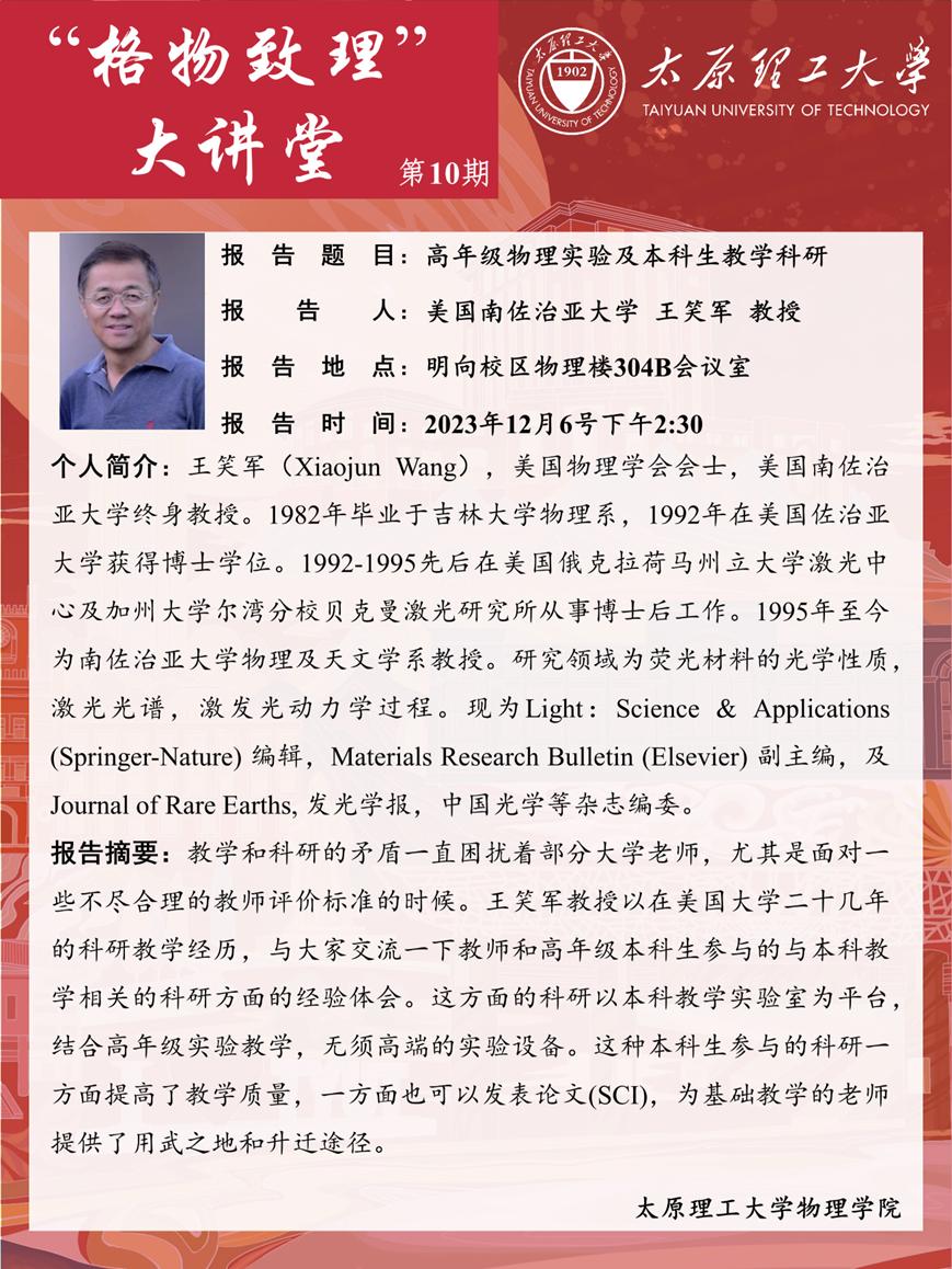 2023年12月6号下午,为了解决困扰着部分大学老师在教学和科研的矛盾,以及要如何正确面对一些教师评价标准。物理学院诚邀王笑军教授在物理楼304会议室做一场以《高年级物理实验及本科生教学科研》为主题的学术报告。