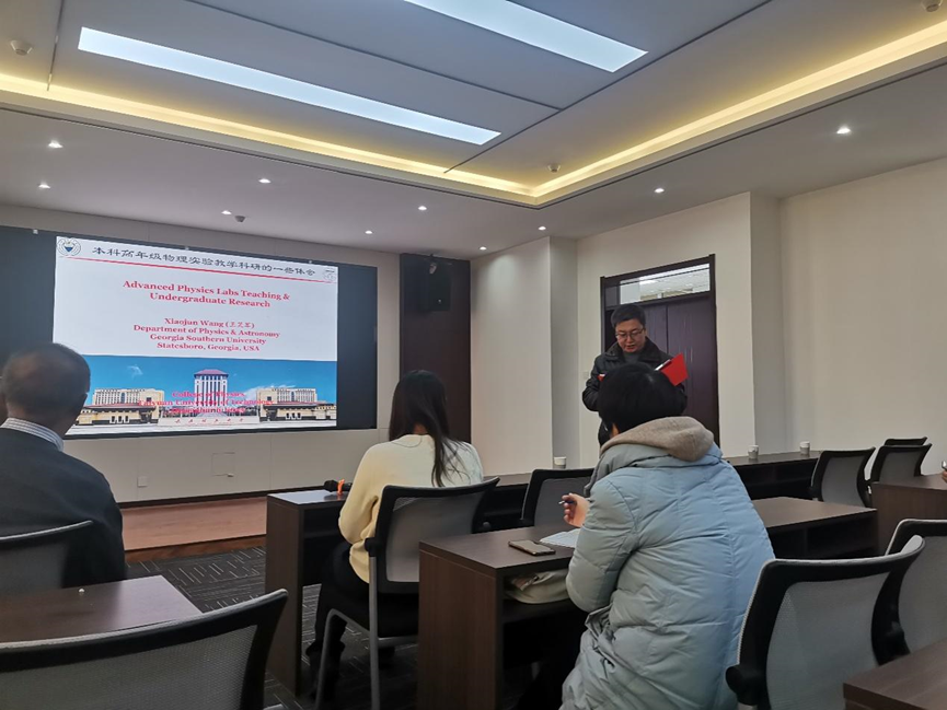 本场报告吸引了众多老师以及学生参与,报告内容聚焦老师们科研与教学难题,为老师们提供科研与教学融洽配合新思路。报告会上王笑军教授以在美国大学二十几年的科研教学经历,与大家交流一下教师和高年级本科生参与的与本科教学相关的科研方面的经验体会。这方面的科研以本科教学实验室为平台,结合高年级实验教学,无须高端的实验设备。这种本科生参与的科研一方面提高了教学质量,一方面也可以发表论文(SCI),为基础教学的老师提供了用武之地和升迁途径。王笑军教授将自身丰富的教学和科研经验都倾囊相授,让在场的老师们都受益匪浅,对于未来教学和科研有了更多的想法。大家也十分敬佩王笑军教授在科研教学方面的经历,会以王笑军教授为榜样,在教学科研中更上一层楼。